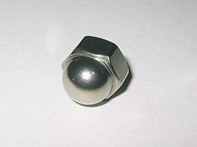 The acorn nut is a type of fastener which gets its name from its shape. Acorn nut is its common name and it is also called a crown hex nut, blind nut, cap nut or domed cap nut. It is a nut that has a domed top to cover the threads. This is to prevent contact with the external thread to protect the threads or protect other things the threads would rub against. In addition the dome gives a more finished appearance. It is usually made of brass, steel, stainless steel (low carbon content) or nylon. It can also be chrome plated and given a mirror finish.